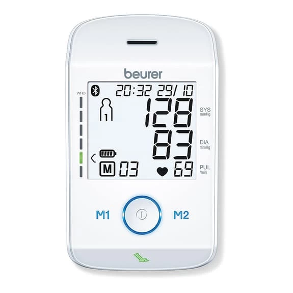 The Beurer BM 85 blood pressure monitor with Bluetooth function features inflation measurement technology that automatically detects how much air the cuff needs to start the measurement. Measurement is more user- friendly thanks to individual pressure adjustment. The HSD function measures the time intervals of your pulse showing if your resting state is adequate to take the measurement. You can control your measurements on your Smartphone or tablet thanks to the Health Manager application once transferred via Bluetooth. It is a sleek and modern design device with a white backlit XL display and touch buttons. Clinically tested according to ESH.