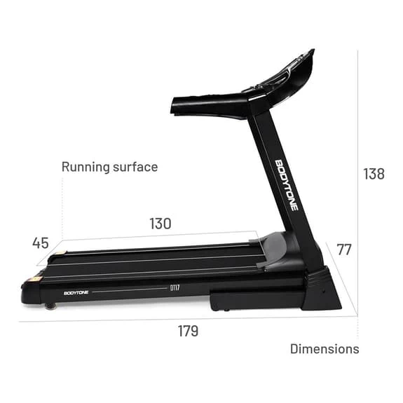 The Bodytone DT17+ treadmill has a wide range of features that will maximize your workout thanks to the engineering of our professional treadmills. DT17 is the treadmill that best combines maximum benefits with an attractive design. Maximise your training sessions and enjoy all the benefits. With the REACT technology incorporated, the platform reduces stress on the joints by cushioning the impact of each stride. The unique orthopedic running strap is made of dense, adherent material offering total comfort and stability for running.