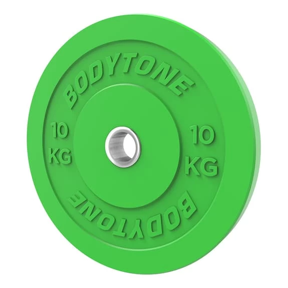 The 10 kg rubber bumper disc with 50 mm internal diameter is perfect for use on Olympic crossfit bars.