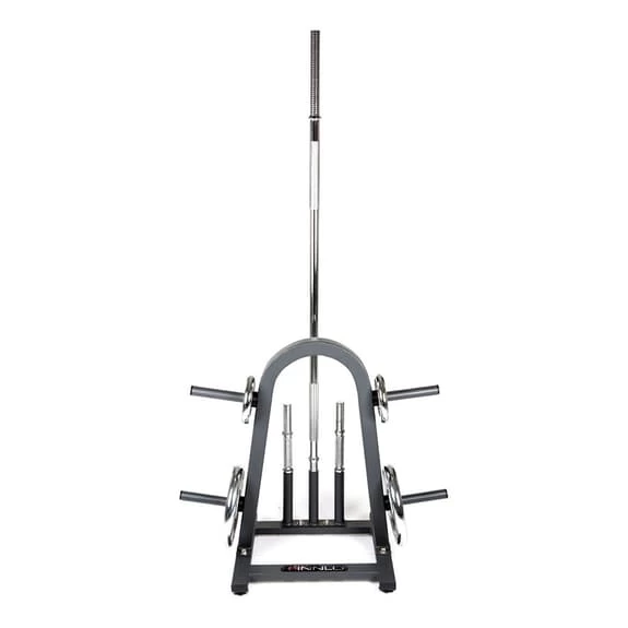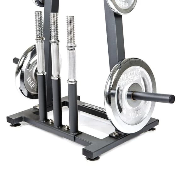 The Finnlo weight and bar rack is ideal for storing weight plates and bars. It convinces by its high stability and offers 4 separate weight holders and 3 bar holders for optimal storage. The rubber bumpers at the end prevent the weight plates from hitting the ground. The 3 vertical supports, 20 cm long, allow you to store the bar and dumbbells in a compact way.
