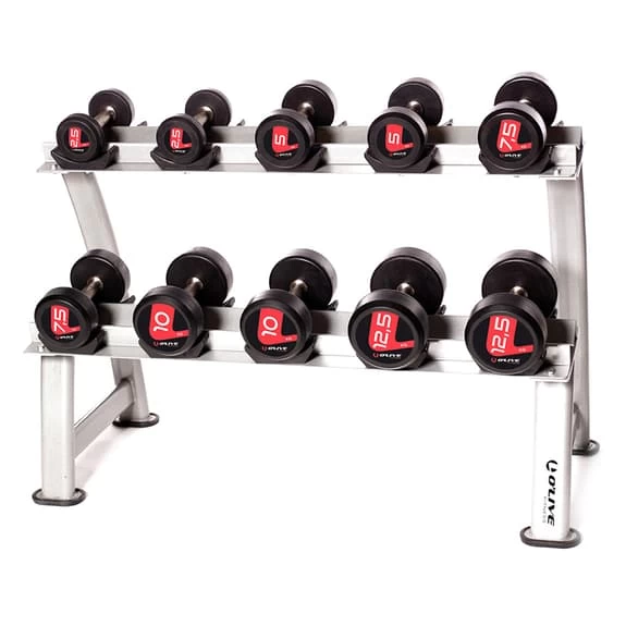 The O’LIVE Pro-Style dumbbell cabinet for 5 pairs is an oval tube rack suitable for the storage of pro-style dumbbells and has plastic seats for proper placement.