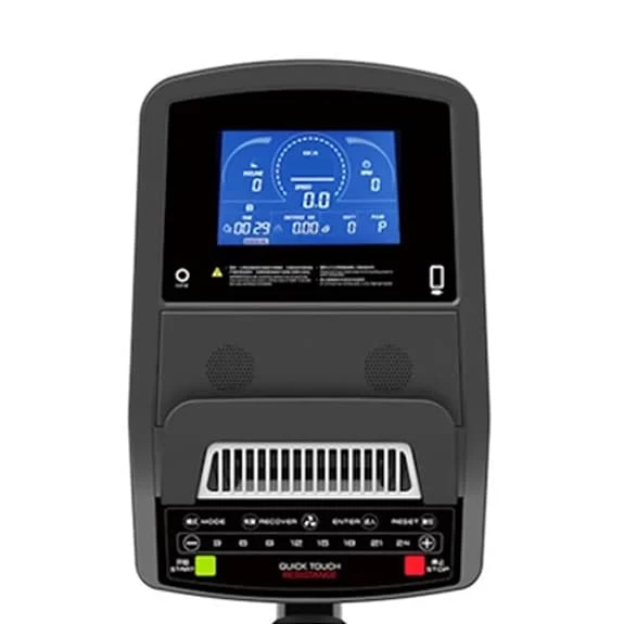 – 7′ backlit LCD monitor with displays for Time, Speed, Distance, Heart Rate, Watts, Resistance Level and Calories