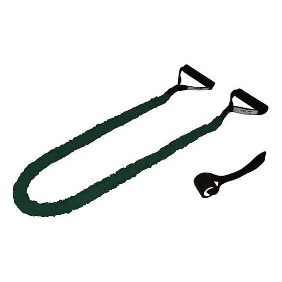 The Tunturi Medium resistance tube allows you to perform many different exercises, such as lateral raises, triceps extensions or vertical rows. The robust protective sleeve ensures high tube strength. So you can train in difficult conditions, on hard or uneven surfaces such as the forest. The two sturdy foam handles provide optimal comfort for training.